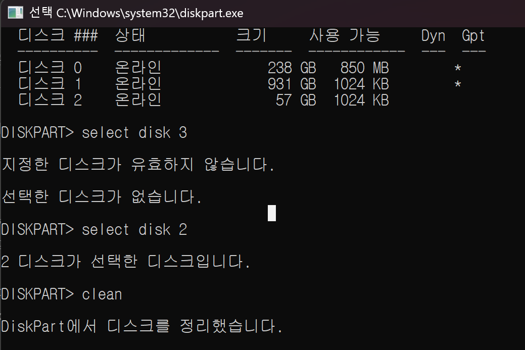 clean후 USB가 탐색기에서 안 보일 수 있습니다. 디스크 관리를 열어 "초기화" 팝업이 뜨면 그냥 진행하시면 됩니다.