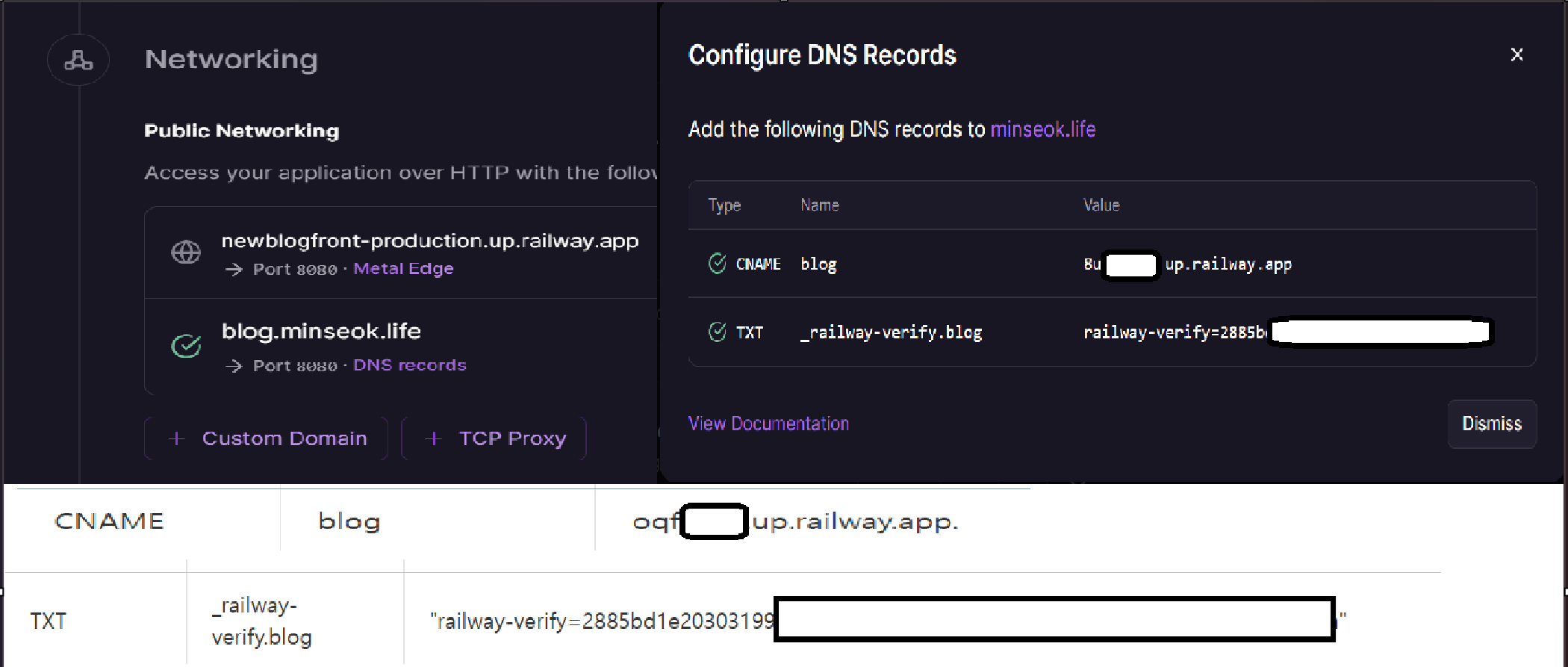 CNAME은 blog.minseok.life가 Railway 서버를 가리키도록 연결해주는 값이다.